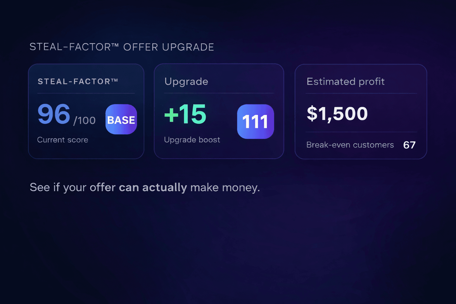 Preview of the Steal-Factor™ offer scoring system showing the base offer score, upgrade boost, upgraded score and estimated profitability including break-even customers. Used to demonstrate how businesses can improve their offers and increase profitability.